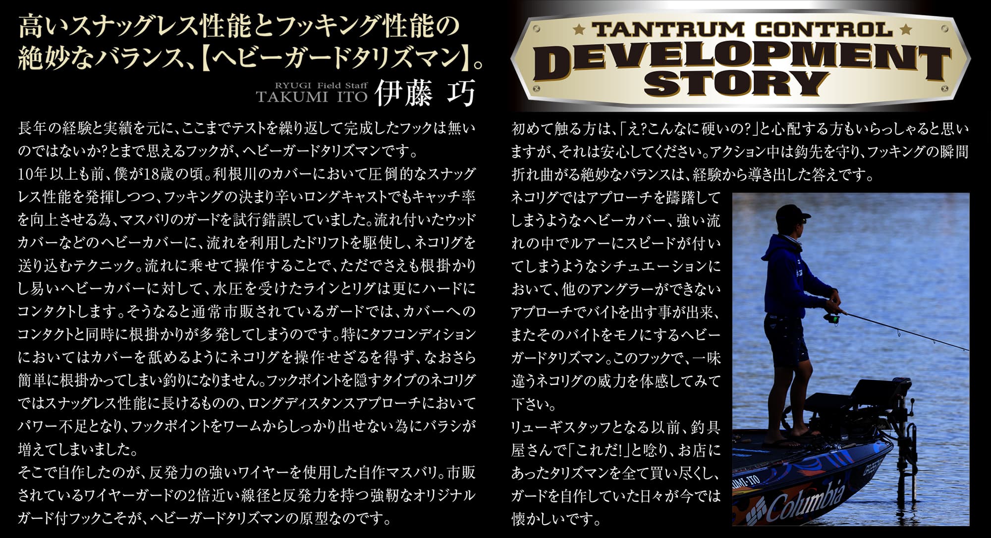 6lb以上のラインを使用したパワースピニングタックルやベイトタックルで、ライト〜ある程度濃さのあるカバーでの使用を前提としたガード付マス鈎。フックはワッキーフックとして高い評価を得るタリズマンをベースに、ガードをセットする為、形状にやや調整を加えた。
