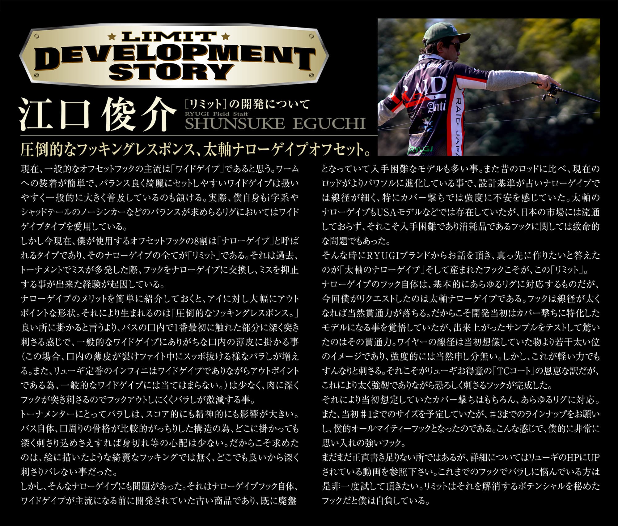 これらの性能に、RYUGI的フック論を注入。フッキングのダイレクト感を殺さず、しかしながら、フックに掛かる負荷を極力分散する丸みを持たせたベンドデザイン。