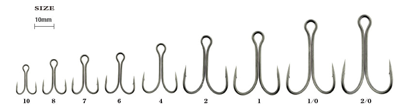 #8-6は小型ルアーで使用される状況を想定し、やや細軸に設定。弱いフッキングパワーでも、十分な貫通力を発揮する。#4-1は通常使用を前提に、ピアストレブルと同等の軸線径を採用。強度を確保。#1/0-2/0は大型ルアーへのセットを想定。必要以上に太すぎない線径設定とする事で、高い貫通力を発揮する。2本のフックの開き角は、スナッグレス効果を重視しつつも、フッキング率を下げ過ぎない絶妙のセッティング。