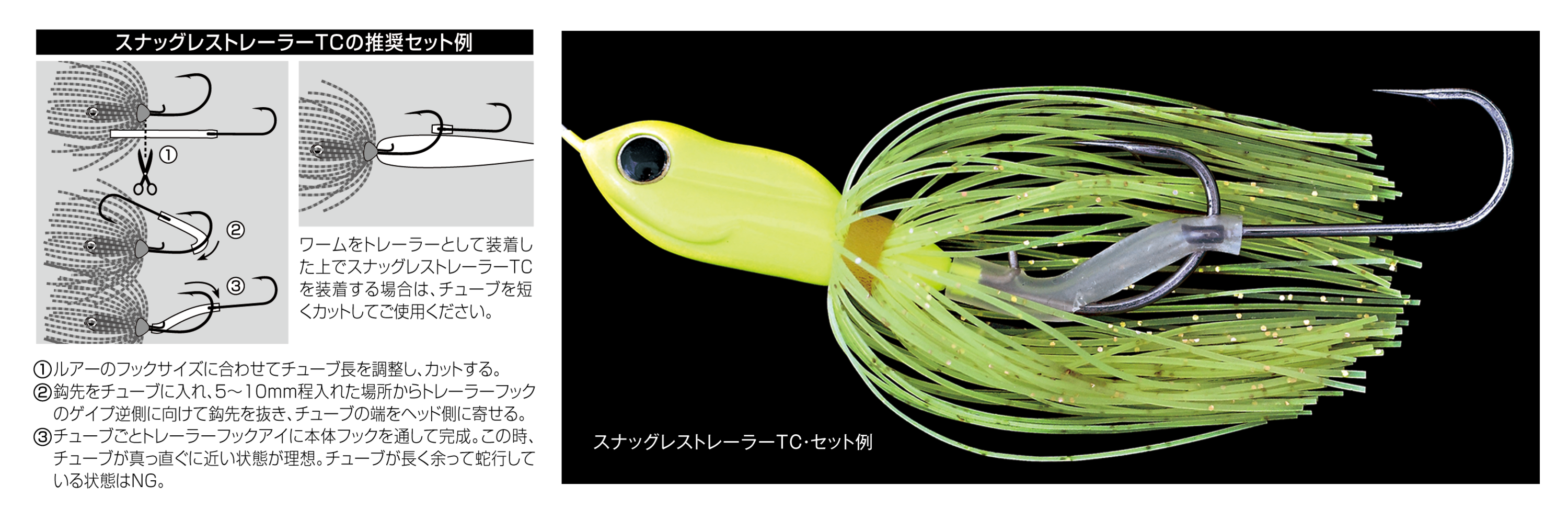 特徴的なフックの装着方式を採用する事により、ワイヤーベイトのスナッグレス性能を犠牲にすることなくフッキングパフォーマンスを向上させるトレーラーフック、それが“スナッグレストレーラー”。TCコートを採用し、フッキングパフォーマンスの更なる向上を図ったのがこのアイテム。フックの強化と共に付属のシリコンチューブの強度も大幅に向上させ、更に快適に使いやすく進化した。