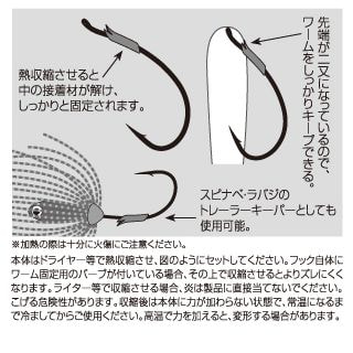 熱を与えると本体が収縮すると同時に、内側の接着剤が溶け出し、フックにしっかり固定される。チューブ先端は二又で、ワームの固定力が強い。 逆側はゆるいテーパーカットになっており、ワームセット時にワームを切り裂きにくい。ジグヘッド、ラバージグ、スピナーベイトのトレーラーキーパーとしても使用可能。
