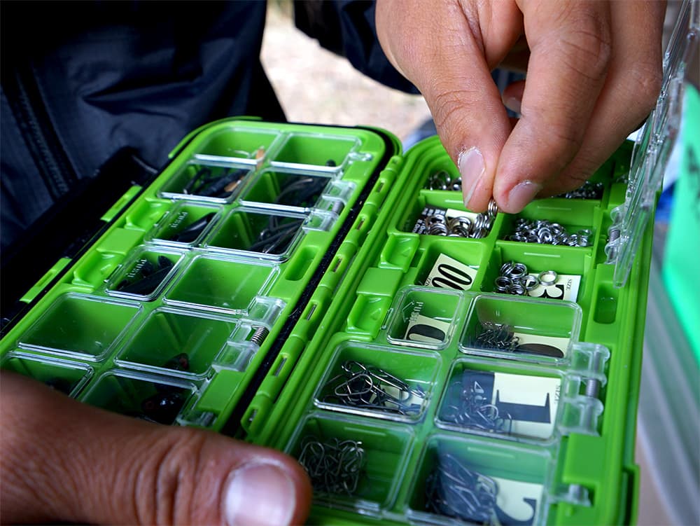 シンカー、ジグヘッド、スナップ、フック等のアイテム収納は不便だった。パッケージのままでの収納だと、パッケージが破損したり、必要な時に必要なモノがすぐ取り出せなかったり…。各アイテムの残量把握もしづらく、気付けばフィールドで必要なモノが無いということもしばしば。また、雨の日など水を被ってしまって気付かぬうちに中身が錆びてしまっていることもある。