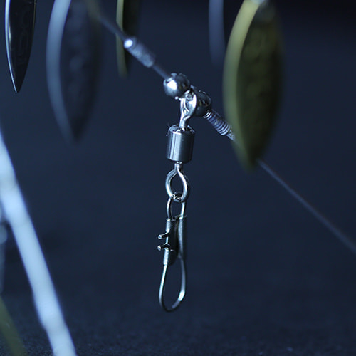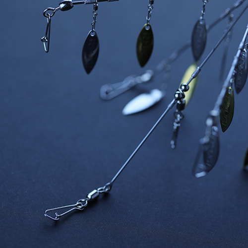 揚力を持たせ、浅いレンジでもスローリトリーブを可能とする12枚のオリジナルブレード。ベイトの群れを彷彿とさせる、高いアピール力も併せ持つ。状況により、着脱が可能。