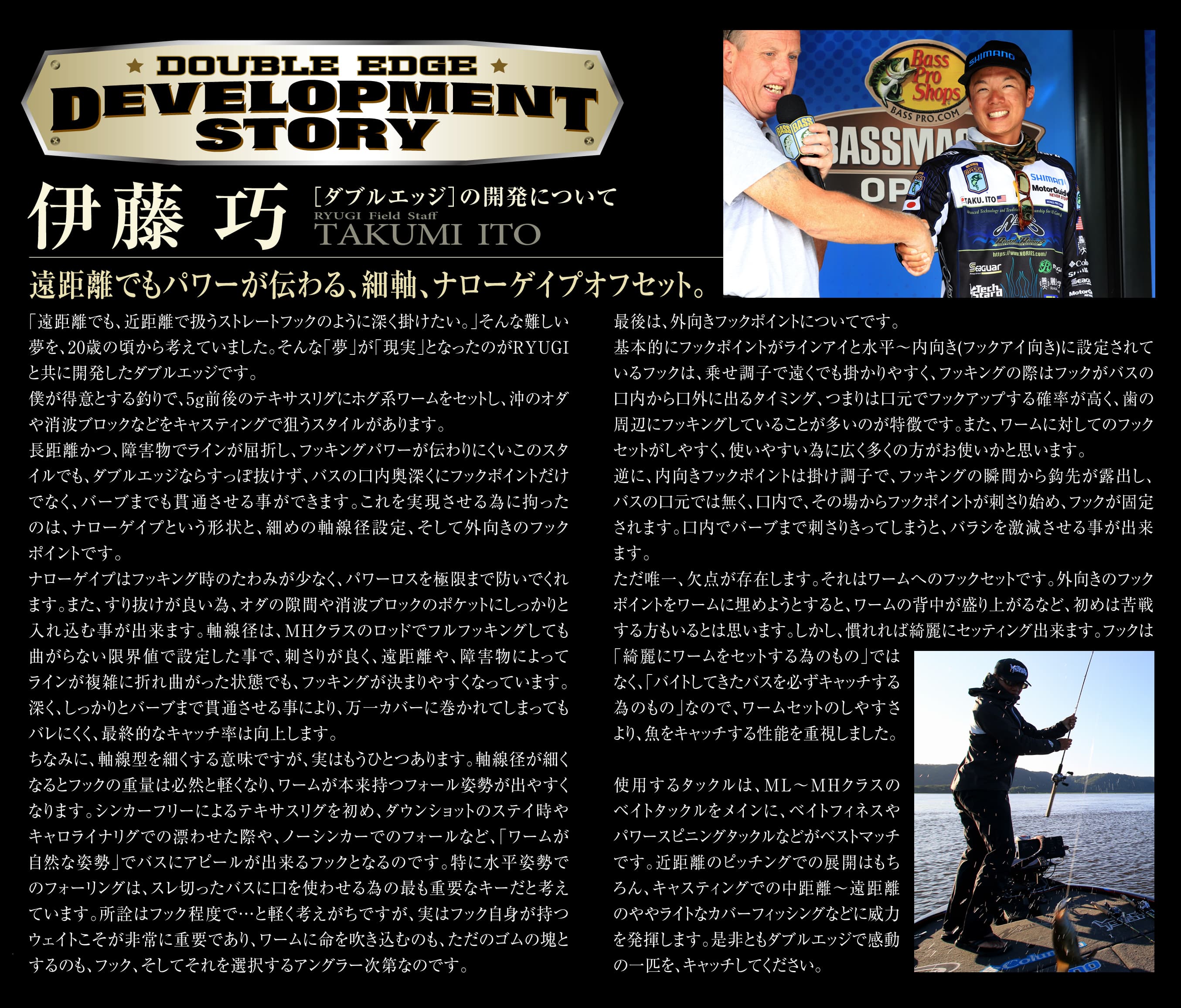 強引すぎるファイト、オーバースペックタックル(Hクラス以上のロッド、16lb以上のライン)は、あえて想定せず、ギリギリまで細い軸線径に設定。その上でロングテーパー、TCコートを採用。フックポイントの掛かりが良く、カバーやテトラ越しなど、十分にフッキングパワーが伝わらない状況の消え入るようなバイトですらもスッポ抜けず、なんとか魚にフックを掛ける事を目的に設計した。