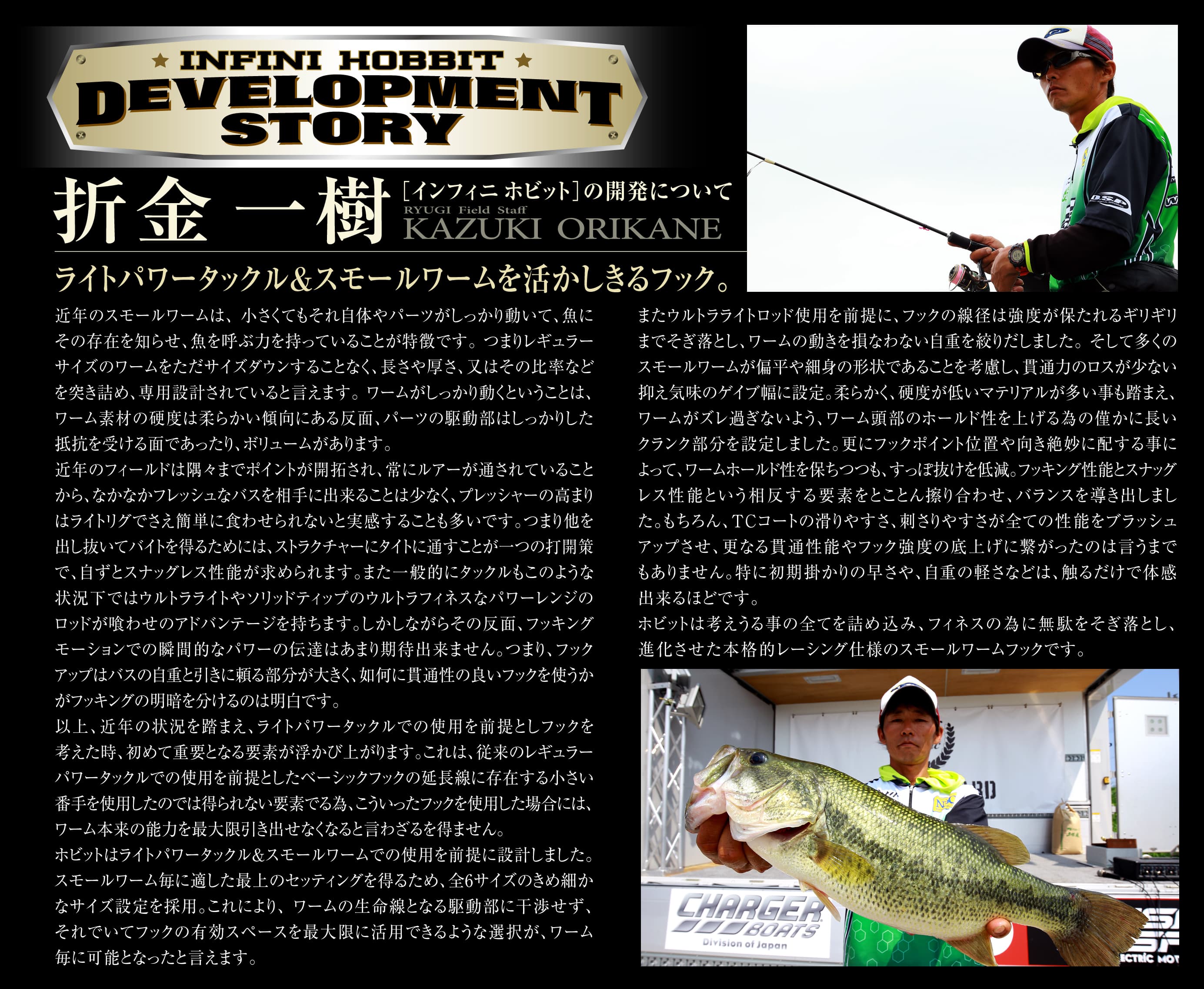 一匹の価値が異常な程高い昨今の激タフフィールドにおいて、折角食わせた魚を捕り逃す事は、もはや命取りと言える。高いフッキング率を誇るオフセットの名鈎“インフィニ”を、この様な極限状況下でのフィネス仕様にカスタムし、生まれたのがこのフックだ。