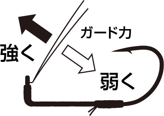 ガードを根本から矢印の方向に調整することで好みのガード力に変更することができます。ガードから鉤先の距離が遠いとガード力は強く、近いと弱くなります。
