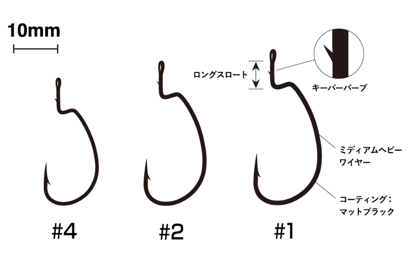 小型でありながら太軸で高い強度を誇るパワータックル対応のオフセットフック。アイ~クランクまでの距離を長く設定し、そこにキーパーバーブを配置。コーティングにはワームが滑りにくい“マットブラック”を採用し、ワームのズレを強力に排除する。ロングキャスト時やウィードやストラクチャーとコンタクトした際もワームがズレにくく、ピックアップまでロスなく魚を狙い続ける。