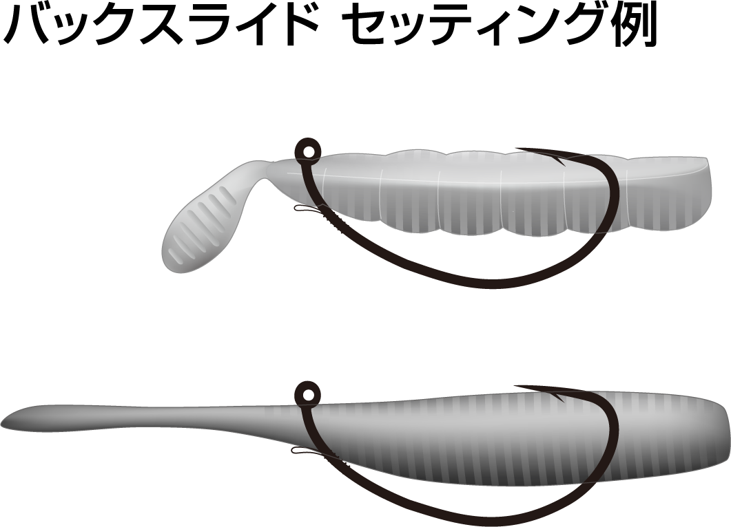 オフセットフックでバックスライドセットをした場合、アイ位置の自由度は低い。スライドピアスは専用のワームキーパーによって、アイ位置を前後に移動させることができる。アイ位置を変えることで、リグの支点と重心が変わり、フォールの“角度”、“スピード”の調整がしやすくなった。ネイルシンカーを使用すれば更なる微調整が可能になる。
