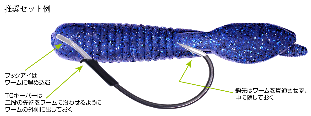 熱を与えると本体が収縮すると同時に、内側の接着剤が溶け出し、フックにしっかり固定される。チューブ先端は二又で、ワームの固定力が強い。 逆側はゆるいテーパーカットになっており、ワームセット時にワームを切り裂きにくい。ジグヘッド、ラバージグ、スピナーベイトのトレーラーキーパーとしても使用可能。