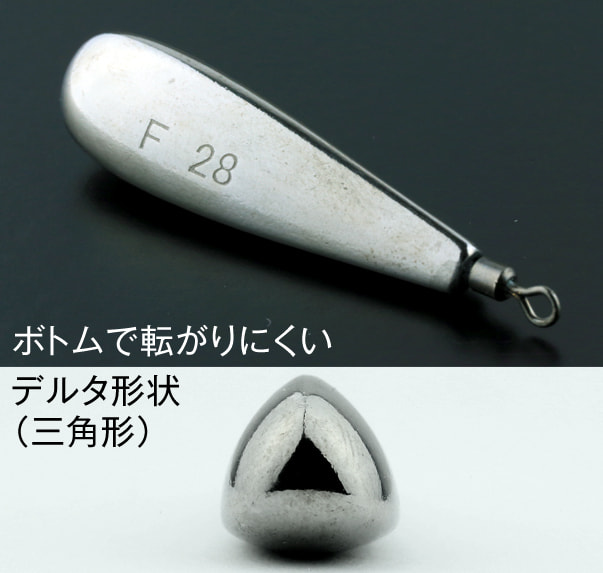 高比重焼結タングステンを使用する事で、高い感度と素早い沈下性能を実現。本体にはウェイトを表記する事で、フィールドで迷い無く意図するウェイトを選択出来る。ラインセット部はカンを採用した為、重量のあるシンカーをしっかり結びつける事ができ、不意に外れないように工夫した。形状は、底部に重心がある縦長形状。縦長にする事でシンカーの根がかりを回避しつつも、沈下速度を妨げない。また、本体断面は三角形となっている。ボトムで横倒しになった際、不用意に転がりにくい形状だ。従来のシンカーだと、ボトムで意図せず転がり、シンカー自らが岩の隙間などに落ち込み、根がかりを誘発していた。このシンカーなら、それが起こりにくく、根がかりしづらい。素早く選び、素早く投入し、根がかりによる時間のロスを抑える。とことん使いやすく仕上げる事で、釣りをする時間・集中力を妨げない。結果が釣果に現れるのは、言うまでも無いだろう。
